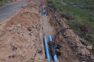 La intervención contempla la instalación de 2.230 metros de tubería de PVC de 110 milímetros de diámetro para agua potable y otros 2.230 metros de tubería de PVC de 140 milímetros de diámetro para abastecimiento agrícola, lo que supone cerca de cinco kilómetros de nuevas conducciones que refuerzan de forma estructural el sistema hidráulico en esta zona del jable.